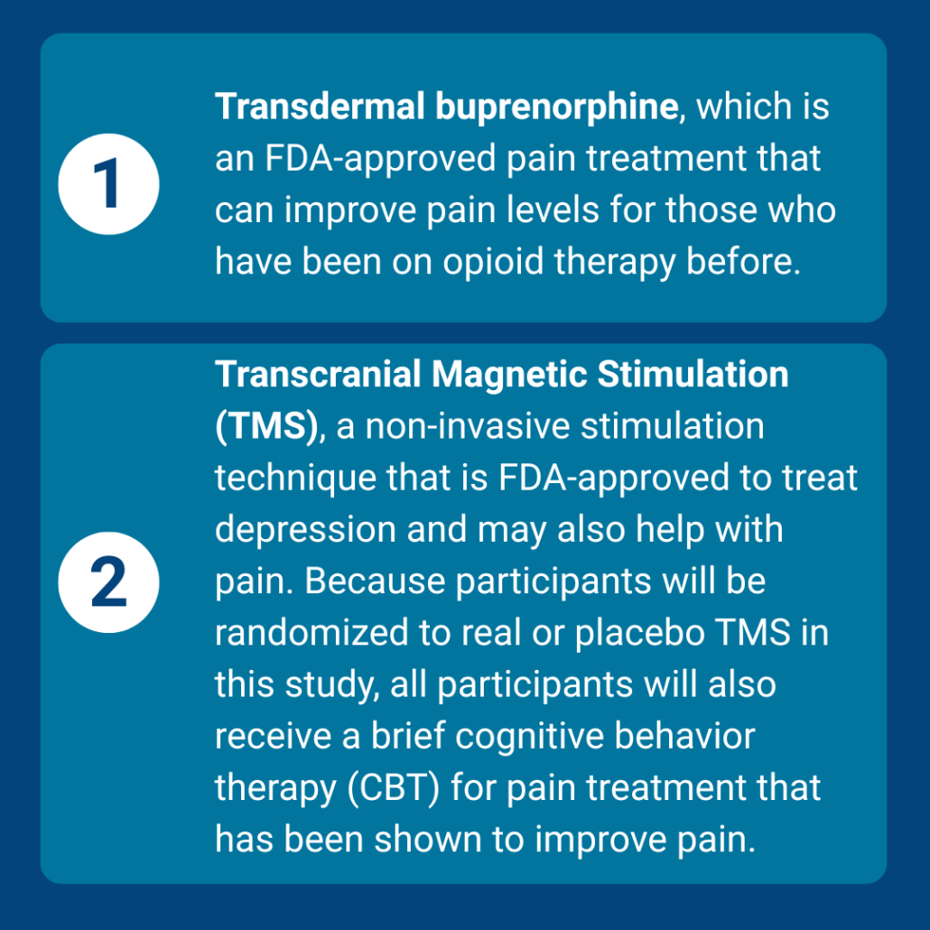 This study offers people with chronic pain the opportunity to “try” other treatments for chronic pain that can improve pain and quality of life – without having to come off or down on their chronic opioids.